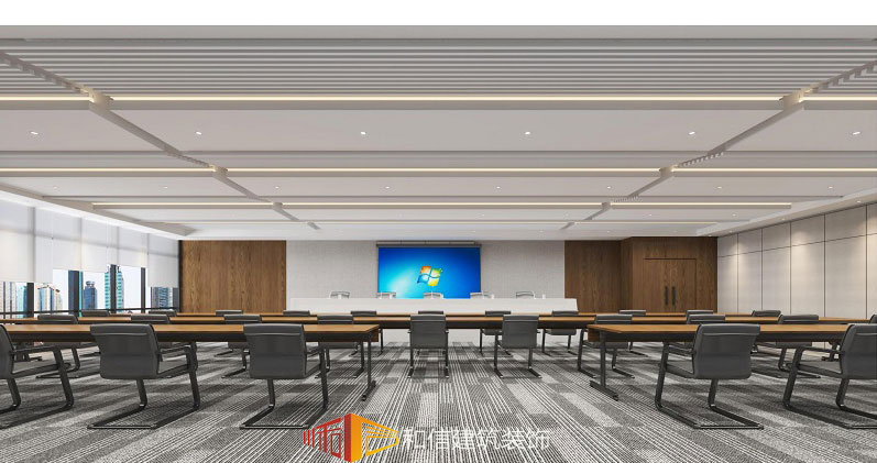 大型會議室最終的呈現(xiàn)效果得到了高度認(rèn)可,會議室空間廣闊,可容納人數(shù)眾多,開闊的視野給開會人員良好的視覺印象,減少了會議的壓抑感,原木色的會議桌椅搭配灰色椅子,形成獨特的空間韻律。