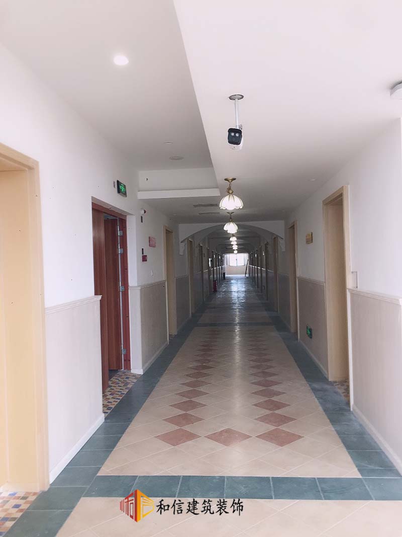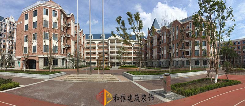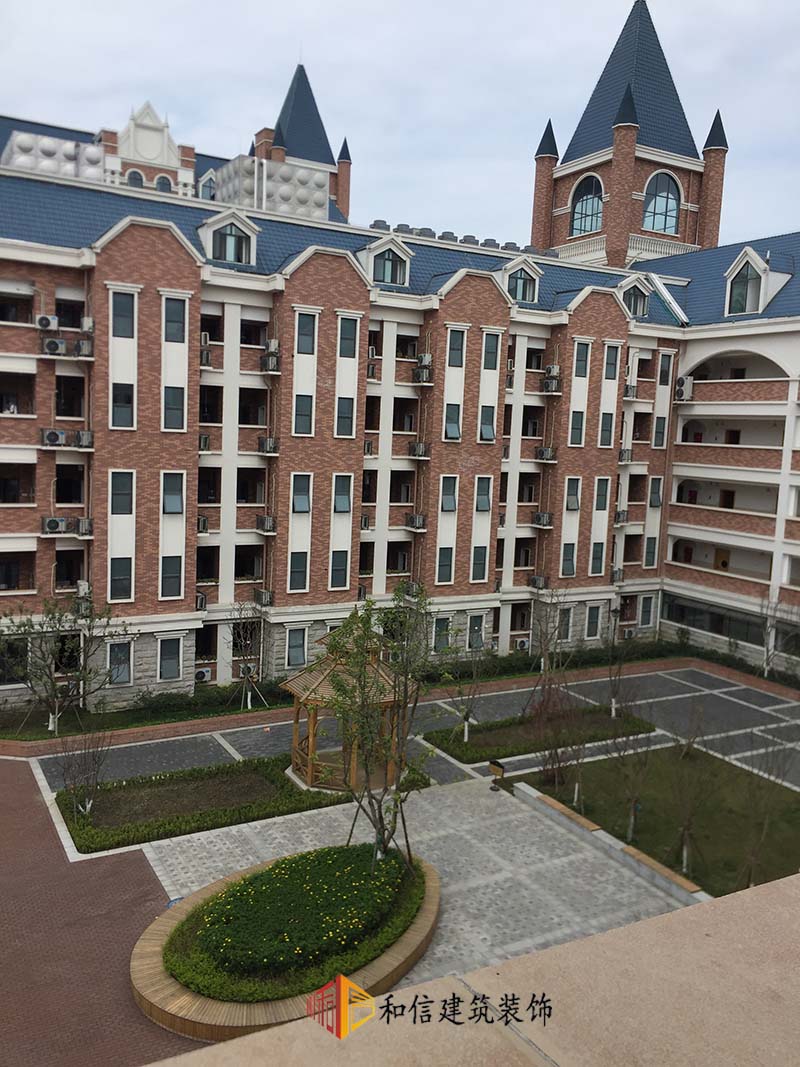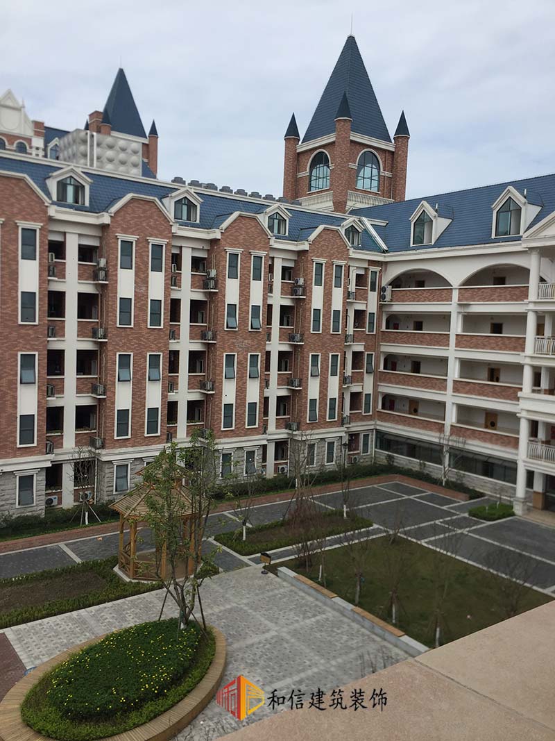 學校裝修外觀為古典城堡建筑風格,錯落有致,色調(diào)搭配和諧、穩(wěn)重的同時冷暖色系比例合適,給人一種積極向上的觀感。室內(nèi)延續(xù)了建筑的色彩搭配,古典精致的吊燈安排在學生宿舍走廊,希望帶給學生一種溫暖的歸屬感。